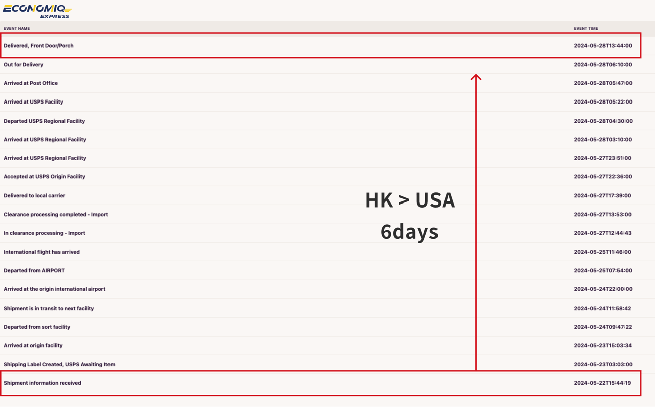 透過EconomiQ Standard國際快遞服務,在清關順利及無其他外在阻礙因素下,一般派送時間約需7至11個工作天,最快可於6個工作天內完成遞送。Fuuffy除了提供線上查詢包裹寄運動態外,更導入AI異常監控系統,能自動偵測包裹遞送過程中的任何異常狀況。一旦發現異常,Fuuffy客服團隊將立即介入處理,確保訂單能夠儘速恢復正常遞送。