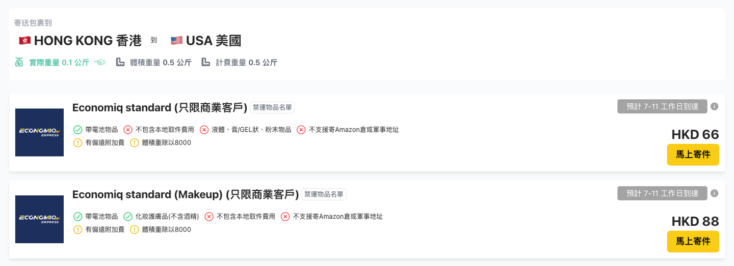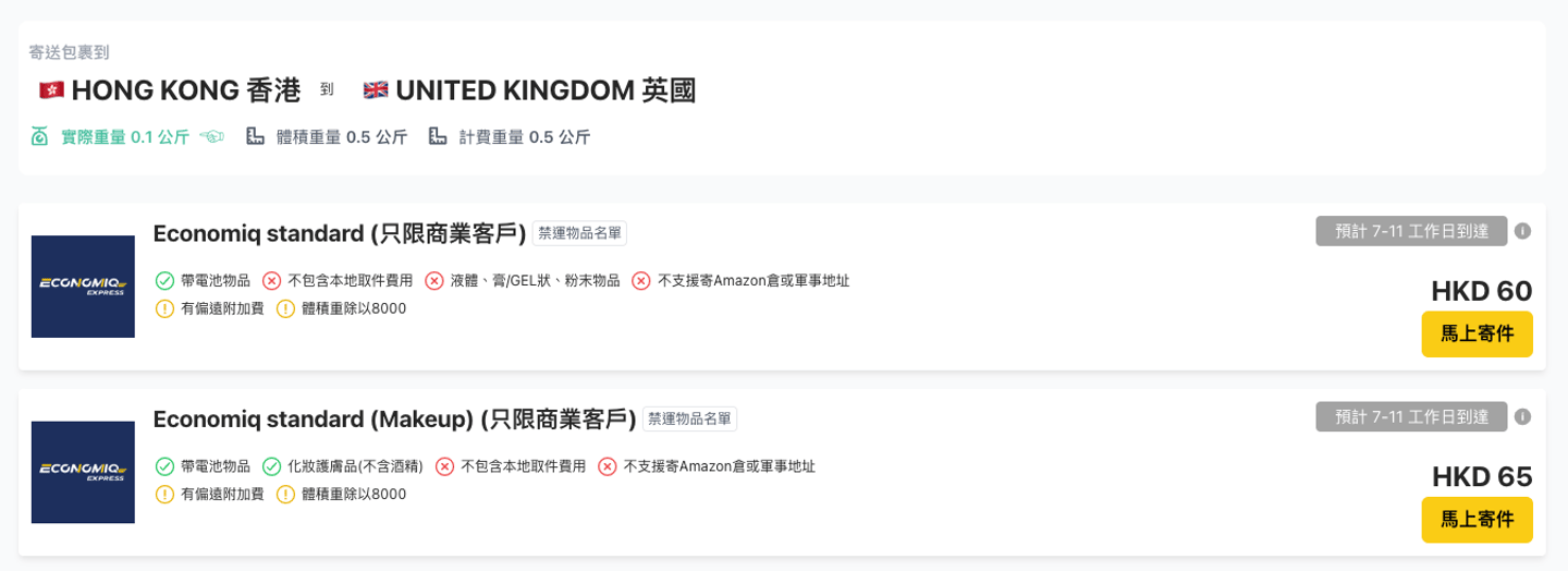 一般國際快遞運費計算方法都是「體積重除5000」或「體積重除6000」,而EconomiQ Standard 採用「體積重除8000」的計費方式,大幅降低了寄化妝品和護膚品的運輸成本。