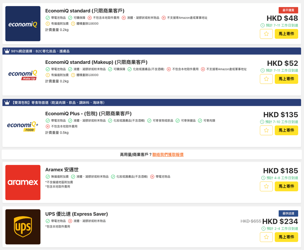 如果您特別看重追蹤功能,Aramex的服務比香港郵政的特快專遞便宜了HK $121,是一個相當划算的選擇!