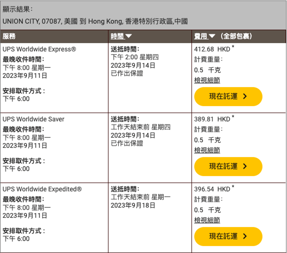 以0.5kg計算,UPS Worldwide Express 由美國寄香港的國際運費最平也要 HKD 390。