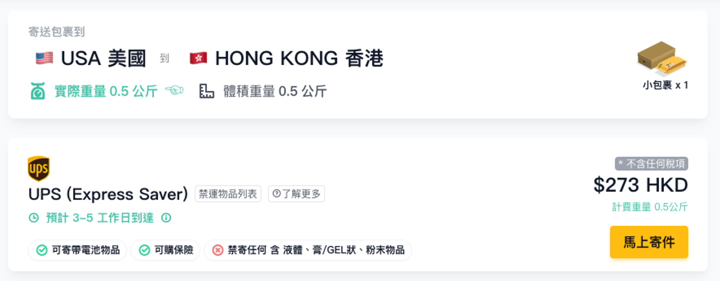 如果在Fuuffy.com,享用Fuuffy x UPS 獨家優惠:同樣0.5kg由美國寄香港的運費比UPS原價平HKD 112,只要 HKD 273。如果你想預估其他重量運費,請點擊【免費報價】