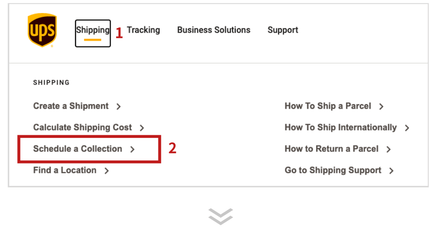 第一步:在包裹寄件地的UPS官網置頂目錄中,點擊 [Shipping] ,然後再點選[Schedule a Collection]。