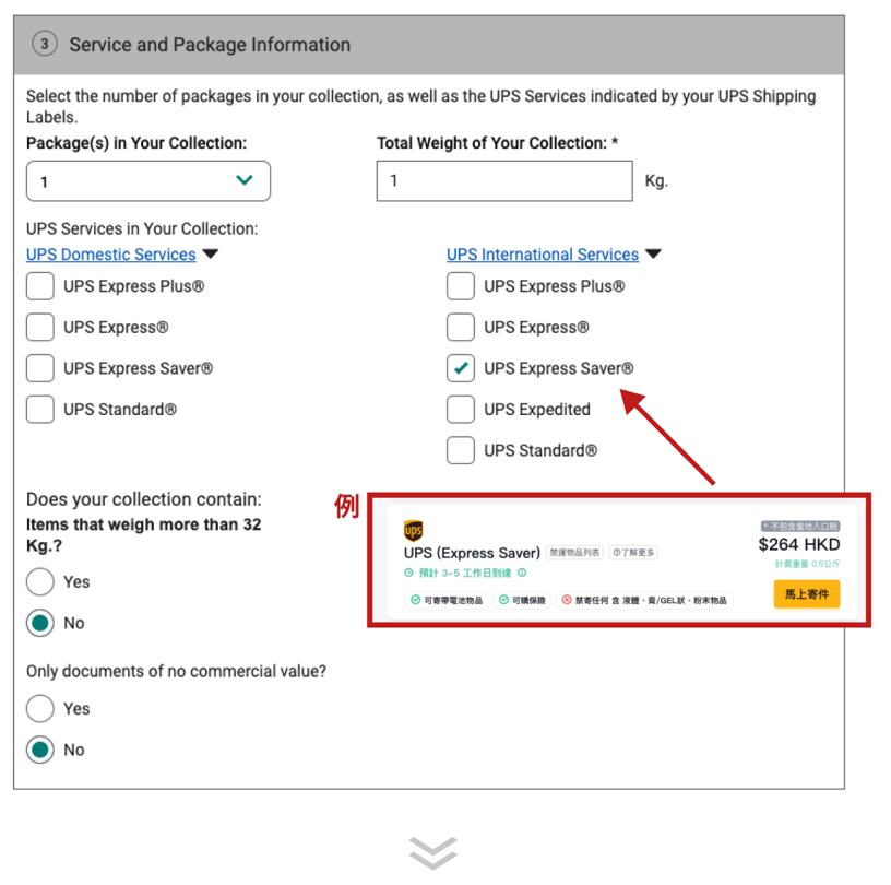 第四步:輸入包裹資料: 數量及總重量,並選擇使用的UPS快遞服務 (落單時選擇的快遞服務)。