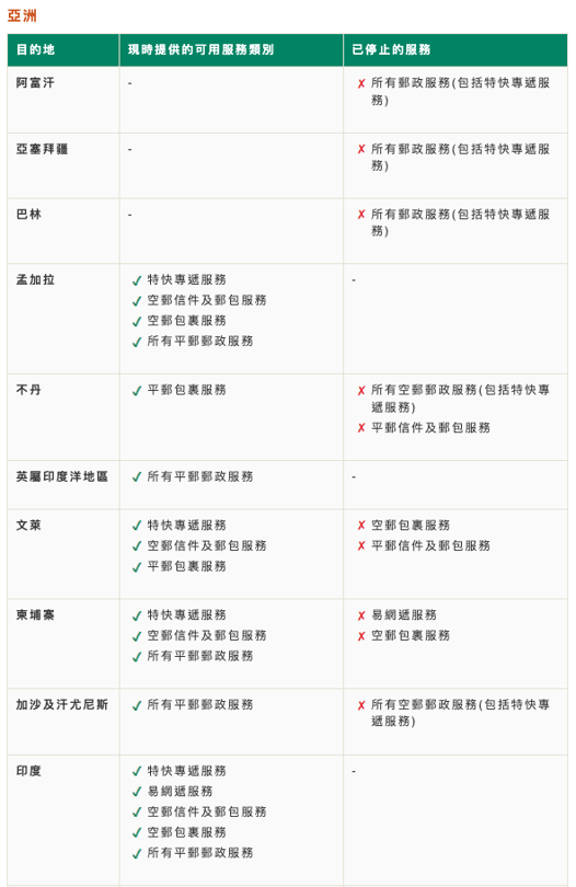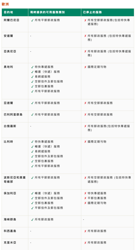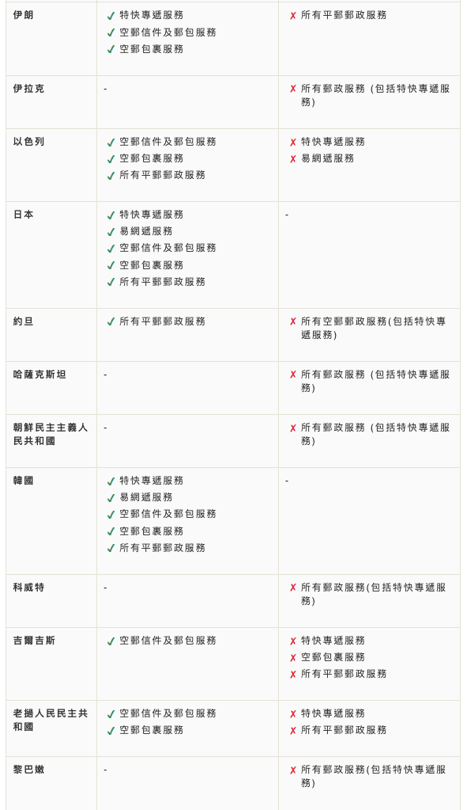 詳情請看:郵局各海外目的地現時可提供的服務類別(截於1-8-2023)