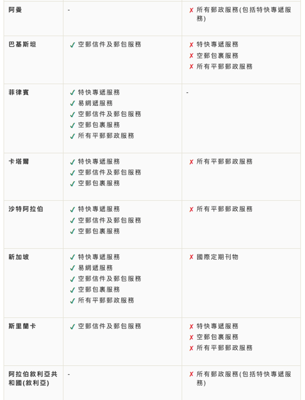 郵局並不是所有的國家和地區都提供寄件服務。有些特定的目的地可能會有額外的限制或者不提供服務。郵局並不是所有的國家和地區都提供寄件服務。有些特定的目的地可能會有額外的限制或者不提供服務。