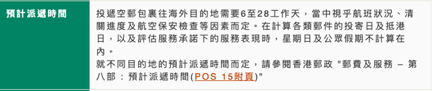如果使用空郵包裹到海外,派送時間約為6至28個工作日。
