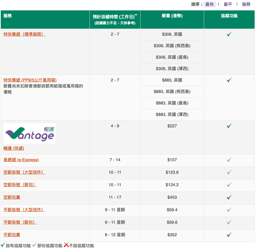 你知道郵局的郵費計算方法嗎?一般來說,郵局會根據包裹的重量和目的地來計費。以香港寄英國為例,寄0.5kg的包裹空郵到英國,最快又有追蹤包裹服務的話,選擇特快專遞的運費是HKD $306。你可以有興趣:香港本地平郵郵費2023:寄英國、美、澳、加價時間錢一眼睇晒!
