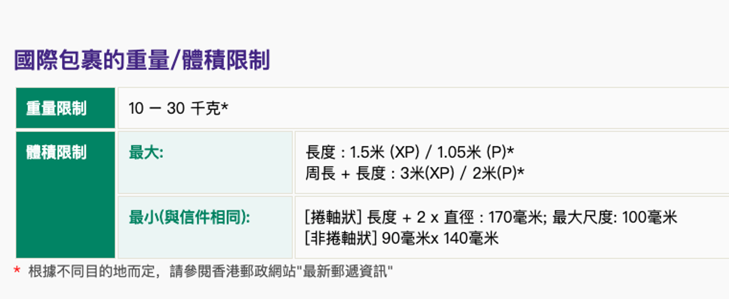 在郵局寄件時,記得要留意包裹的重量或體積限制,,避免額外的費用和可能的延遲。包裹重量需在10至30kg,體積限制可以參考下圖。