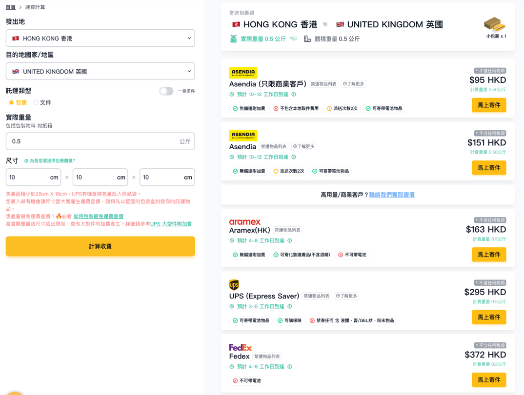 同樣以香港寄英國0.5kg為例,在Fuuffy貨飛國際快遞格價平台上,最平HKD $95就可以寄貨物到英國。就算是使用更快的UPS也只需HKD 295,並已包括上門取件費用。