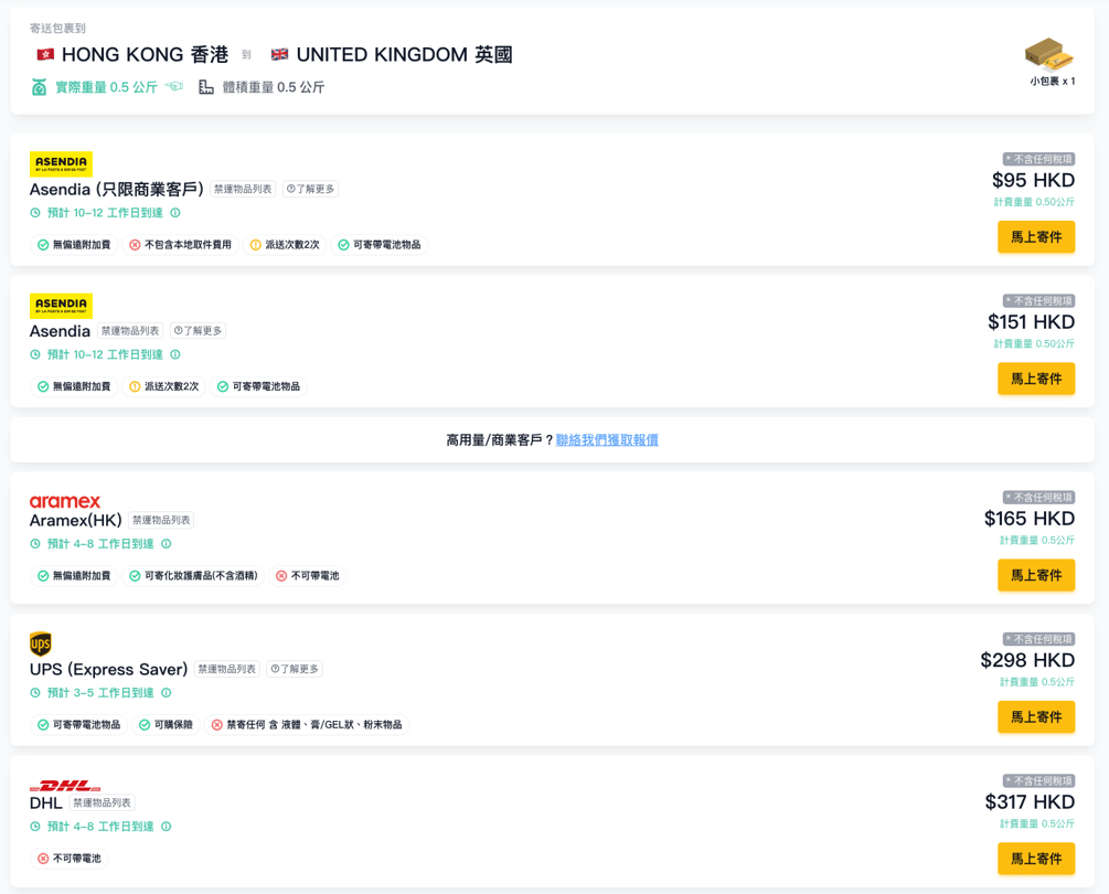 免費比較各大國際快遞運費和時效,提供UPS、DHL、Fedex等超過16間快遞低至3折的獨家優惠。