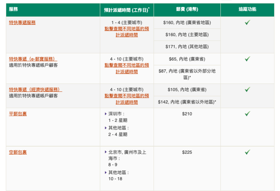 e 郵寶(以廣東省為例):運費低至港幣 $65,約 4–10 個工作天送達