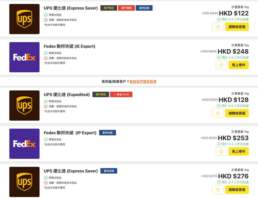 尤其是寄往內地一線城市,國際快遞在清關效率與穩定性方面具備明顯優勢。透過 Fuuffy 貨飛平台,可以同時比較UPS、FedEx、Aramex 等多家快遞的運費與預計時效,讓寄件選擇更清晰透明。對於商業用戶而言,更可享有低至低至9折的折扣,大大提升寄件性價比,而且我们也提供一對一物流方案定制,歡迎聯繫 Fuuffy客服 獲取最優惠折扣!