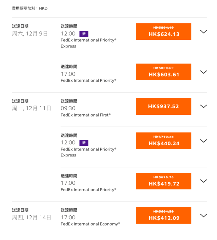 如果你選擇FedEx聯邦快遞將電子產品從香港寄往美國時,若包裹重量為0.5公斤,其費用大約為香港幣440元起。一般而言,包裹的派送時間至少需要4個工作日。