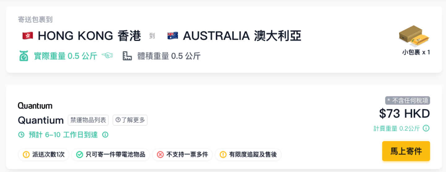 為了更直觀地比較香港郵政及國際快遞服務,我們以設有追蹤服務的空郵為例。選擇香港郵政的特快專遞服務寄往澳洲,運費為HK $260。相比之下,透過Fuuffy平台使用Quantium寄往澳洲的運費僅需HK $73,你可以節省高達HK $187的郵費!