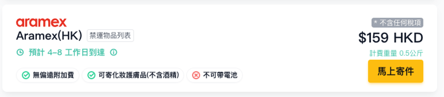 雖然Aramex這個名稱可能對許多人來說不太熟悉,但它其實是一家源自阿聯酋的著名快遞公司,在寄送到中東國家方面具有顯著的優勢。如果你要寄不含酒精的化妝品、護膚品到澳洲,可以考慮使用Aramex,只需 HKD 159 就能幫你將包裹安全寄送到澳洲。