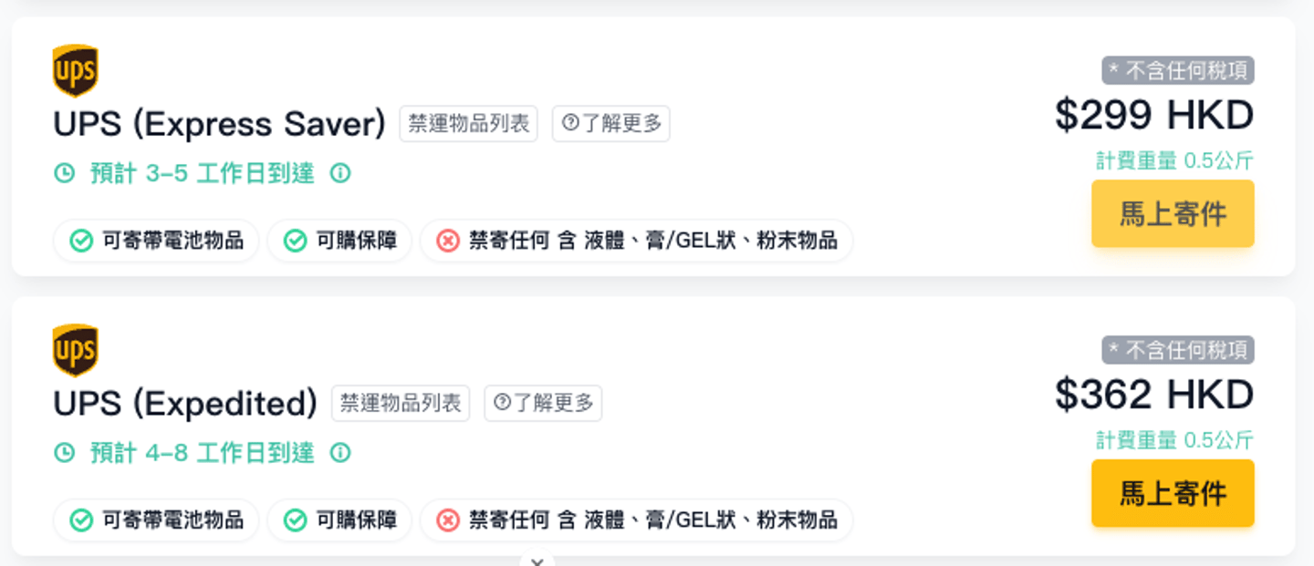 Fuuffy為你比較超過16家國際快遞公司,包括UPS、DHL、FedEx及Aramex等國際快遞運費,並提供高達70%的獨家優惠。根據你的需求、目的地和包裹尺寸及重量,助你選擇最適合的快遞方案。無論是從香港寄往澳洲的文件還是貨物,每家快遞公司都有其特色服務和限制。以下為你比較Fuuffy與合作快遞商折扣後的運費: