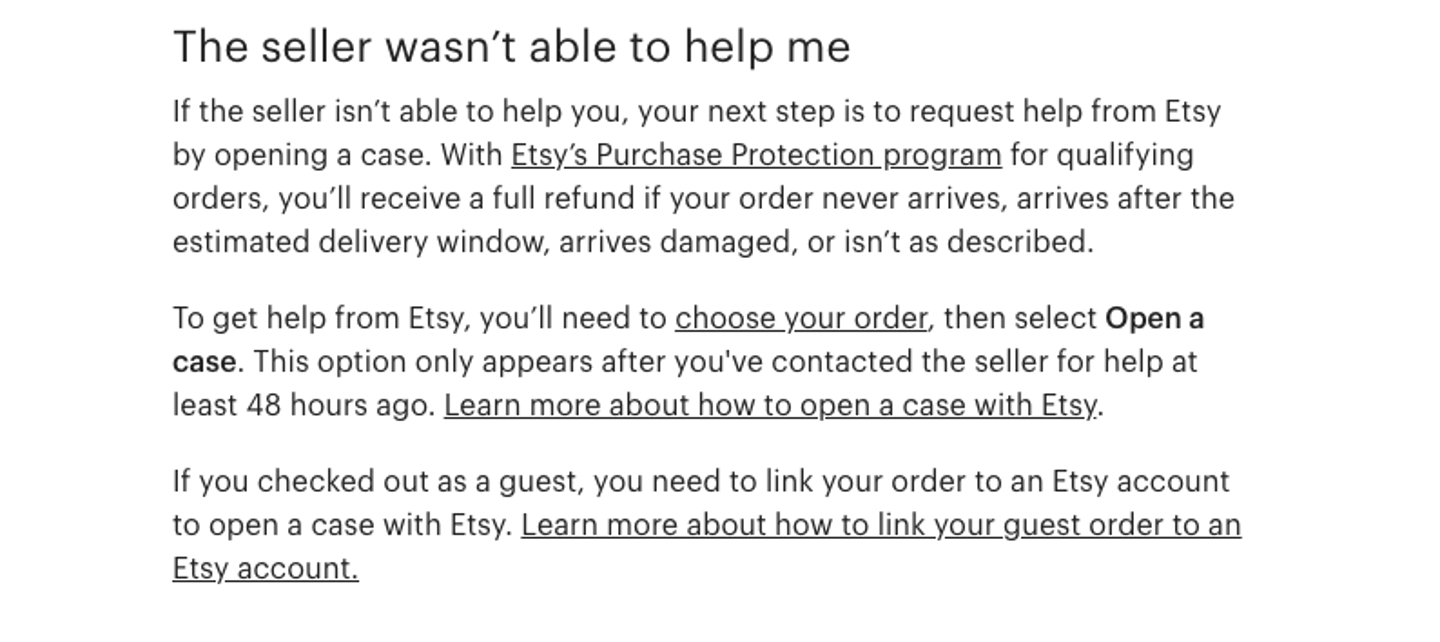 如果很不幸,你跟賣家溝通了半天,還是無法解決問題(比如賣家壓根不理你、就是不肯退貨,或者你們的溝通完全雞同鴨講),別擔心,Etsy 平台還有「最終武器」——Etsy 案件系統 (Etsy Case)。買家可以在特定時間內開啟一個案件,請求 Etsy 官方介入裁決。