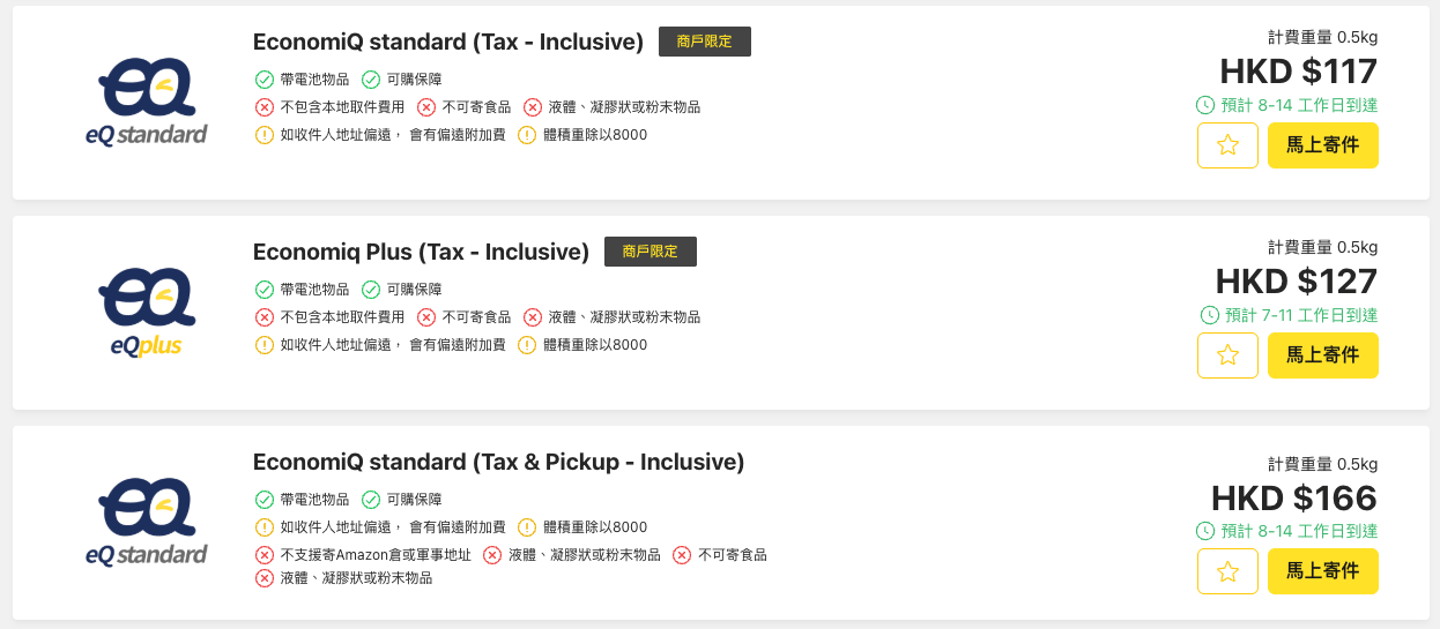 - 香港寄美國關稅提醒: 美國對部分退回商品可能仍要求重新繳稅,尤其當申報資料不完整或未標示為退貨時,仍有機會被課以進口稅費。不過,使用 Fuuffy 貨飛 包稅渠道 eQ standard、eQ Plus 寄往美國,運費已經包含關稅,避免額外支出與延誤。