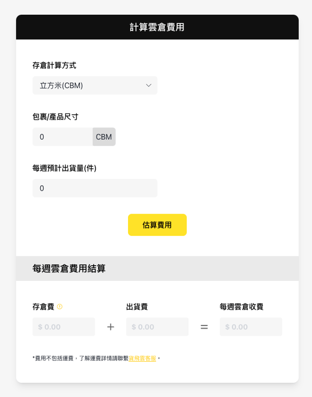 貨飛雲提供了一個便捷的在線 CBM 計算器,您可以在貨飛雲的網站上輕鬆計算您的貨物 CBM。這個工具不僅可以計算 CBM,還可以直接估算存倉費用,非常實用。