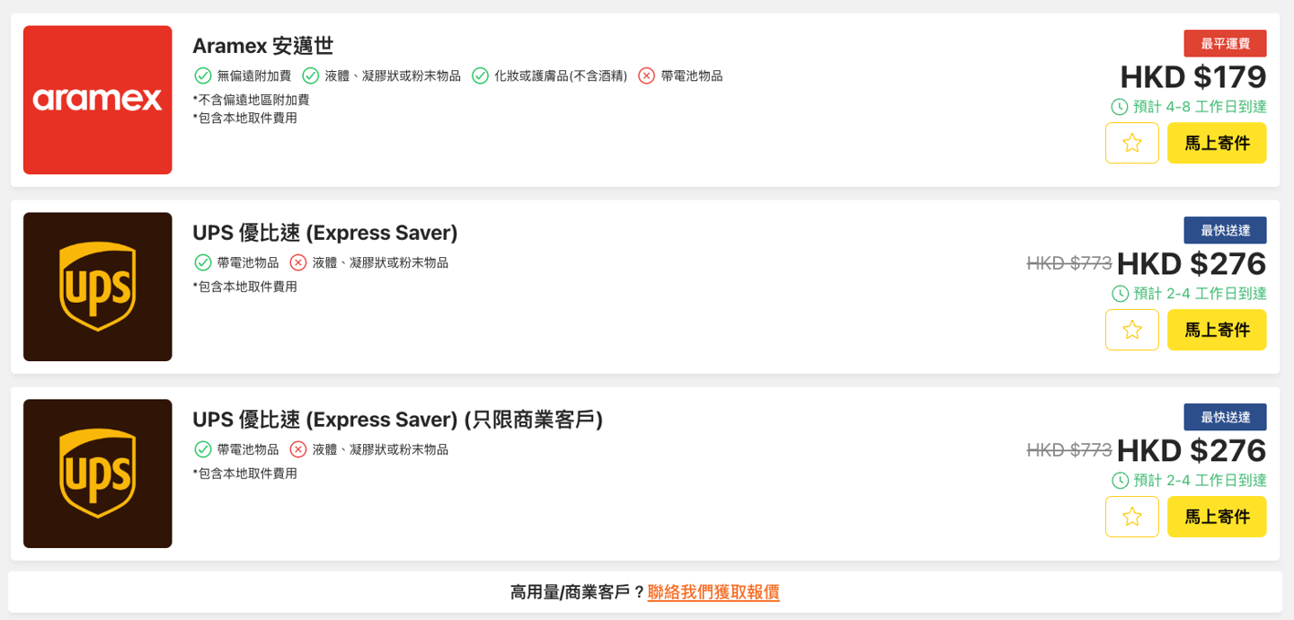 如果您錯過了香港郵政的平郵截郵日期,別擔心!您可以透過 Fuuffy 貨飛國際快遞格價平台,比較 UPS、DHL、FedEx 等國際快遞公司的價格,選擇最划算的方案。從香港寄聖誕卡、信件或文件到英國,Aramex 最低只需 HK$179!立即獲取報價