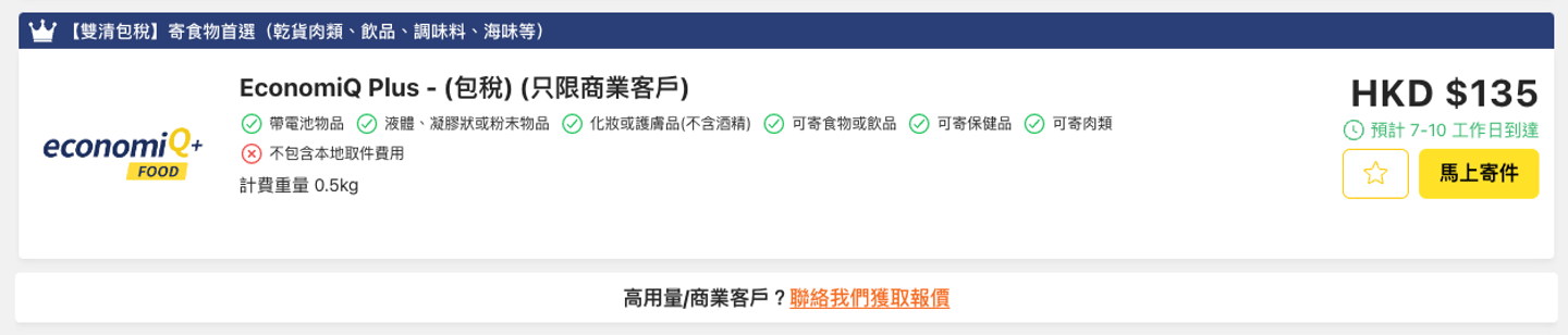 擔心寄藥、保健品、維他命到海外的繁瑣程序?選擇 Fuuffy 平台的 EconomiQ Plus 渠道,享受包稅包清關、上門收件服務!香港寄英國最低只需 HK$135,讓您以最便捷、最實惠的方式寄送您的包裹。立即訪問 Fuuffy 平台,獲取免費報價!