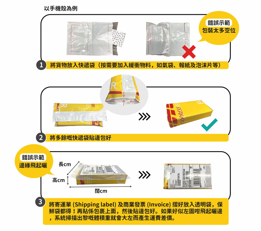 同大家分享一個真實包裝錯誤的個案:話說有位客戶寄件寄一個手機殼,包完的包裹面積唔夠貼寄運單 (Shipping label) 同埋商業發票 (Invoice)。所以快遞員就幫佢重新包裝,原本體積重1kg的包裹變左3kg,因為包裝俾快遞商收左超過一倍嘅運費!