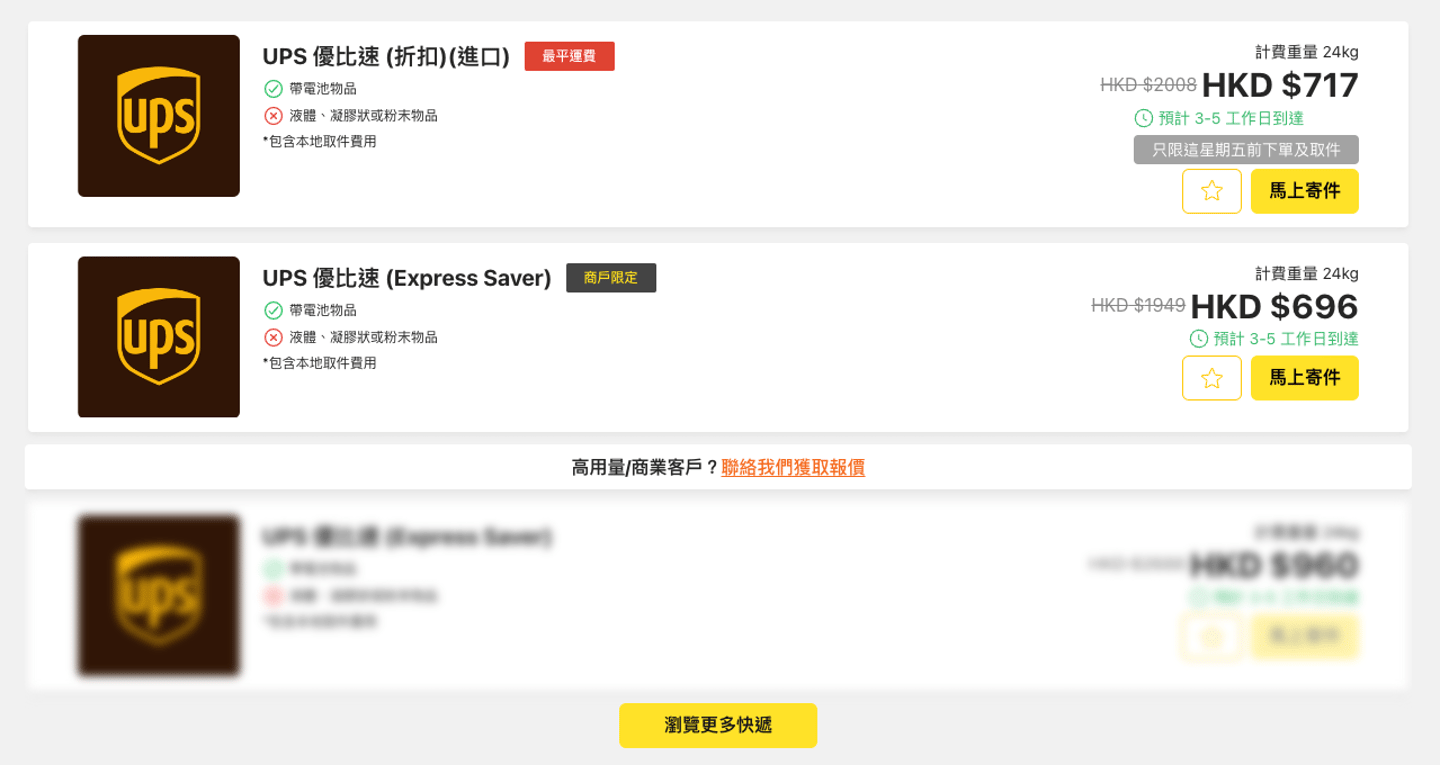 在日本買太多戰利品想寄返香港?不少旅客都會選擇透過UPS寄運行李,但官方價格並不便宜。Fuuffy格價平台提供UPS獨家優惠,助您省錢之餘,亦能安心把戰利品運返香港!寄24kg或以上即享大貨優惠價,每kg只需$29,預計3-5個工作日送達。