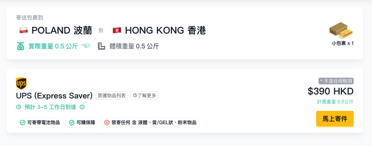 從波蘭寄香港,UPS是眾多國際快遞中性價比較高的選擇。透過Fuuffy平台,從波蘭使用UPS Express Saver服務寄送到香港的最低運費是390港幣,預計派送時間為3到5個工作日。同時提供追蹤服務,讓你可以實時監控包裹的運送狀態。如果你想從波蘭寄電子產品到香港,香港郵政和大部分國際快遞都不能寄送含鋰電池的產品,因此你可以使用UPS的服務。