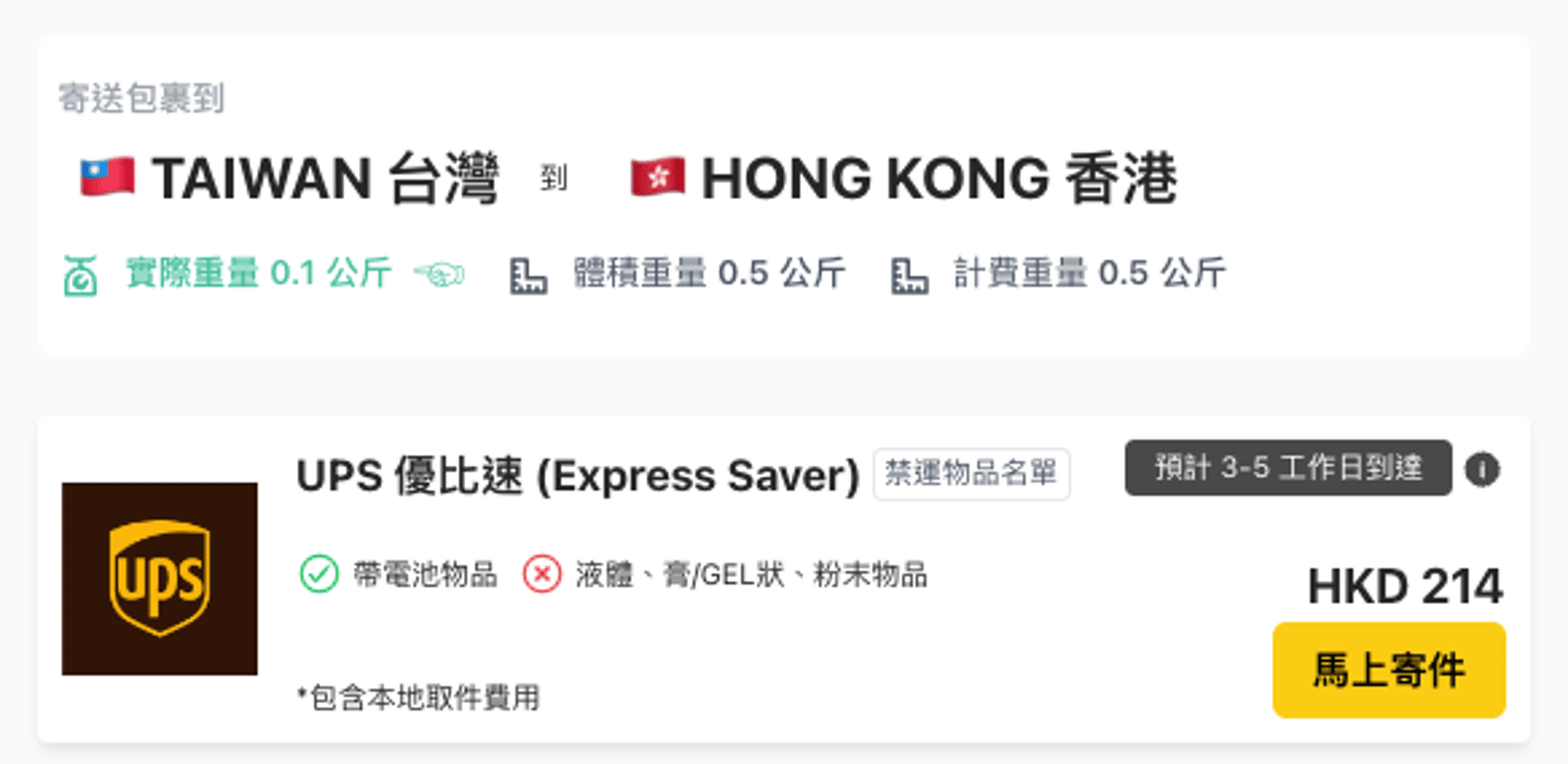 台灣寄香港用UPS最平運費只需HK $214!立即獲取運費