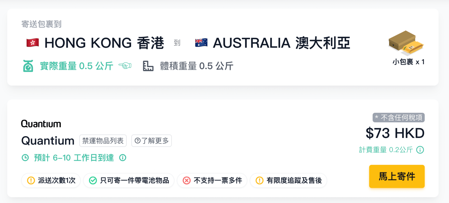 透過Fuuffy貨飛國際格價平台,從香港寄澳洲最平運費的運輸方案是Quantium,運費低至HK $73。無論您是商業客戶或個人用戶,都可以在Fuuffy平台上尋找到合適的物超所值運費方案。