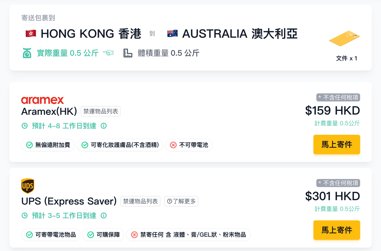無論你是需要寄送商務合同、個人文件還是信件到澳洲,透過Fuuffy貨飛平台選用Aramex運輸渠道,運費低至159港元,相比直接使用DHL或FedEx等快遞服務更加經濟實惠。