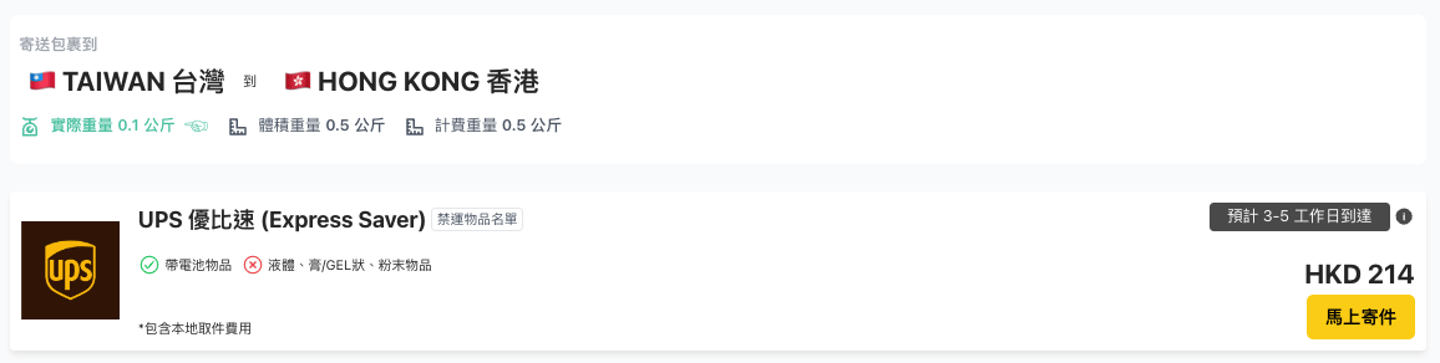 透過Fuuffy平台,用UPS(Express Saver)從台灣寄香港最平運費只需HK $214,最快3個工作日送到。UPS可以寄送電子產品,當不能寄送液體、膏狀或粉末物品。立即計算台灣寄香港運費!