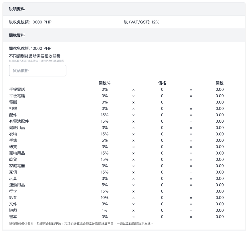 寄包裹到菲律賓免稅額度