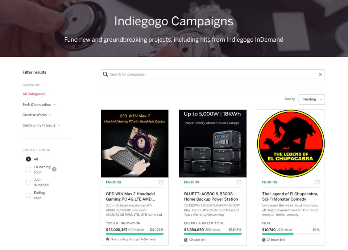 Indiegogo提供廣泛的服務,因此吸引左眾多企業家廣泛使用。主要使用Indiegogo眾籌網站的大部分係慈創新技術、創意作品和社區項目等,因此成為了繼Kickstarter之後第二大的眾籌平台。
