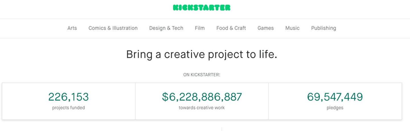 自2009年至今,Kickstarter已經為超過226,144個項目籌集左超過68億美元的資金(截至2020年9月數字)。