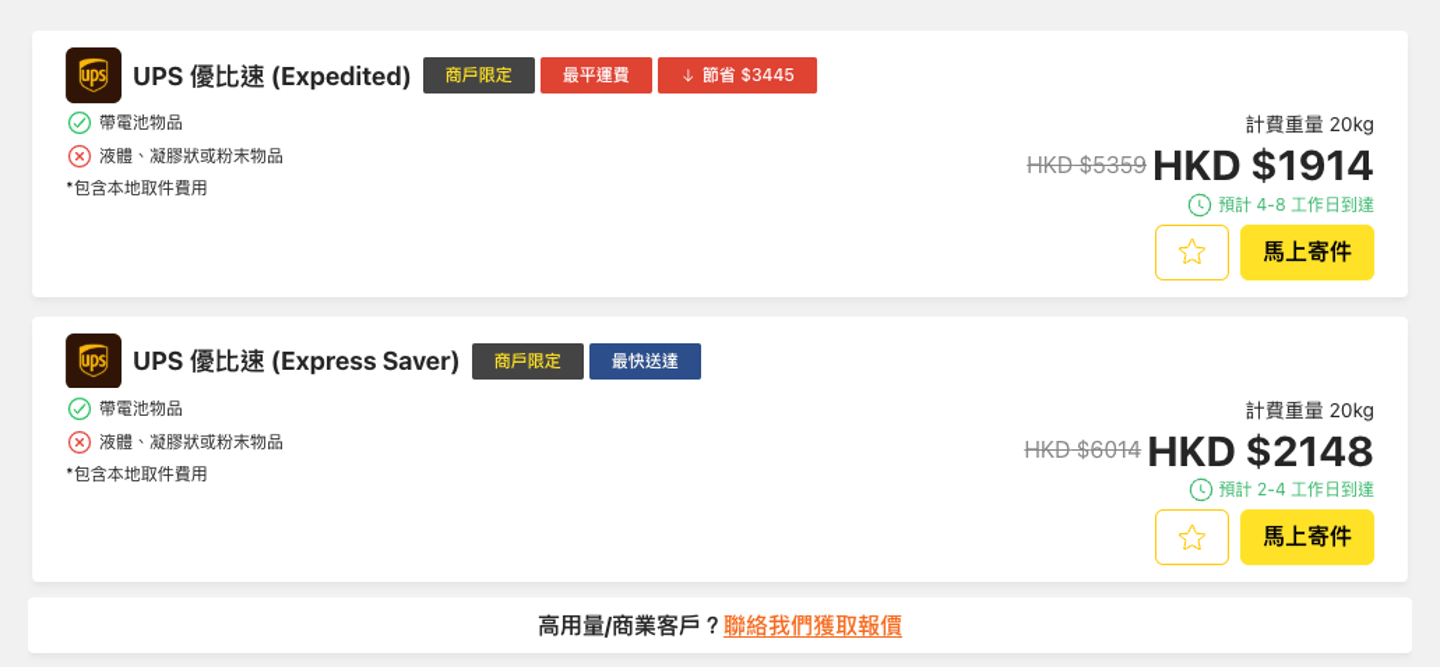 計劃移民搬運到加拿大?透過Fuuffy貨飛國際快遞格價平台,您可享受UPS獨家優惠!以20kg包裹為例,香港寄加拿大運費僅需$96/kg,經濟又實惠。我們提供便捷的上門取件服務,最快2個工作日送達加拿大,讓您的移民搬運到加拿大更省心。無需等待報價,立即使用Fuuffy的 運費計算器,免費計算加拿大運費,輕鬆規劃搬運預算!