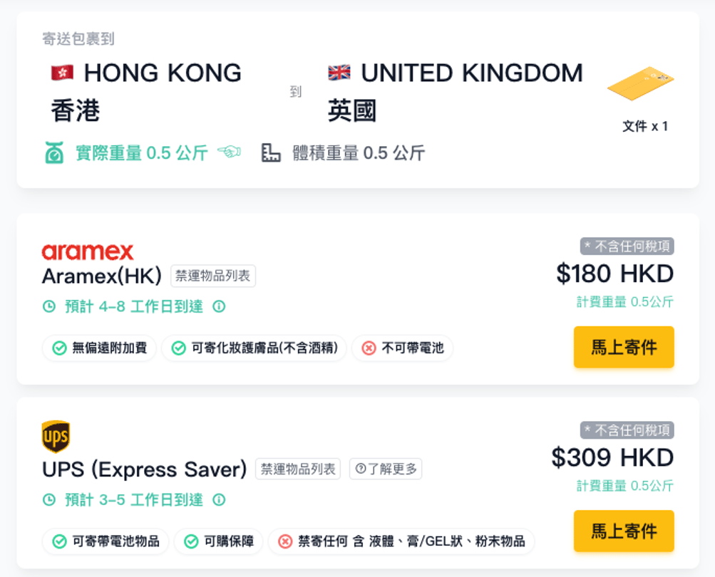 經過與DHL官方網站的報價進行比較,你可以看到透過DHL寄送文件至英國的最低運費大約為港幣405元。在Fuuffy貨飛平台,Aramex的優惠價比DHL便宜了港幣225元,在價格上是更經濟的選擇。