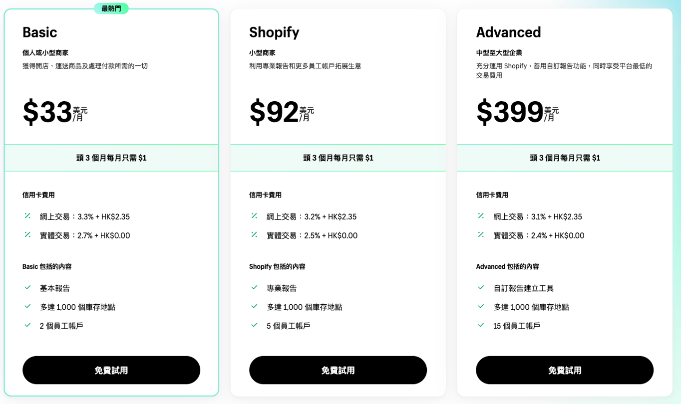 根據網店的不同規模,Shopify 提供了三種主要的方案,以滿足不同業務階段的需求,分別為基本、標準和進階收費計劃。這些方案在基本功能方面相似,但在員工帳戶數和交易費用等方面存在一些差異。而進階收費計劃則提供了更多全面的功能。在選擇適合你的方案時,你可以考慮以下因素: