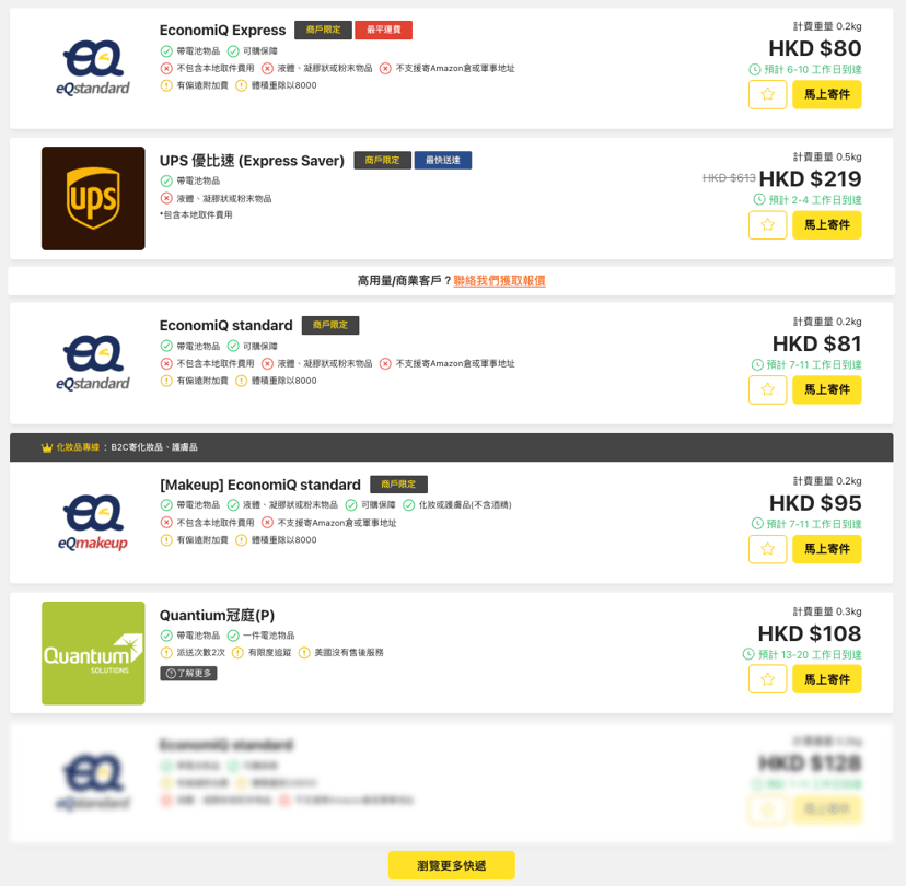 - 快速比較運費:顯示 UPS、DHL、FedEx 等多家物流商的報價,找到最便宜的選項。