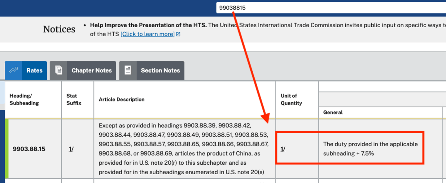 If your product search shows "1/", hover your cursor over "1/" to see a pop-up, such as "See 9903.88.15".Enter 9903.88.15 into the search box, and the system will display detailed information about that provision.