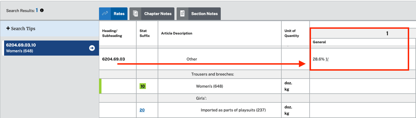 Using women's woven trousers (HS Code: 6204690310) as an example, on the results page, find 1, General (basic product tariff rate). You'll see "28.6% 1/", where "28.6%" is the basic rate. "1/" indicates additional tariffs apply.