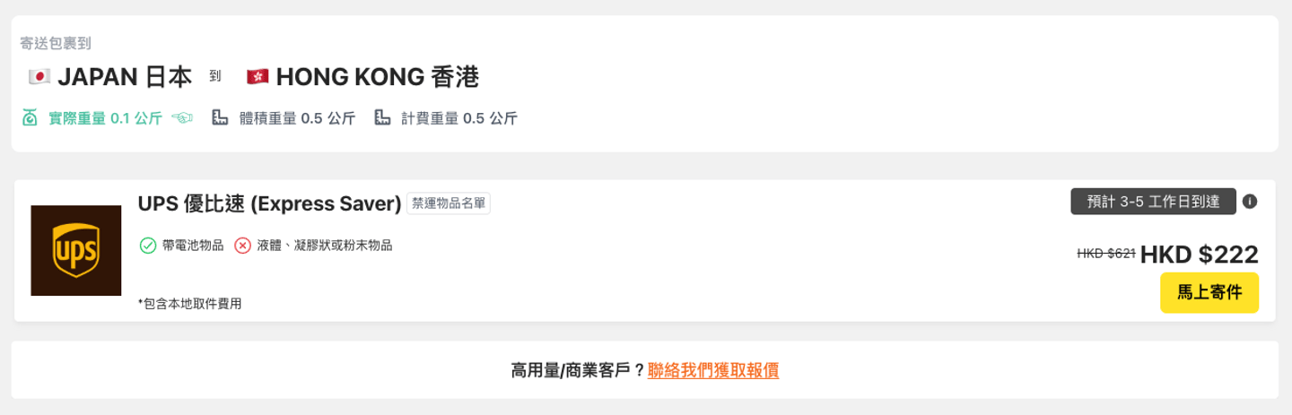 Fuuffy International Express Price Platform provides you with convenient UPS shipping services, including documents, letters and postcards. From Japan to Hong Kong, taking 0.5 kg as an example, the minimum cost is HKD 222, and the fastest delivery time is 3 working days to Hong Kong.
